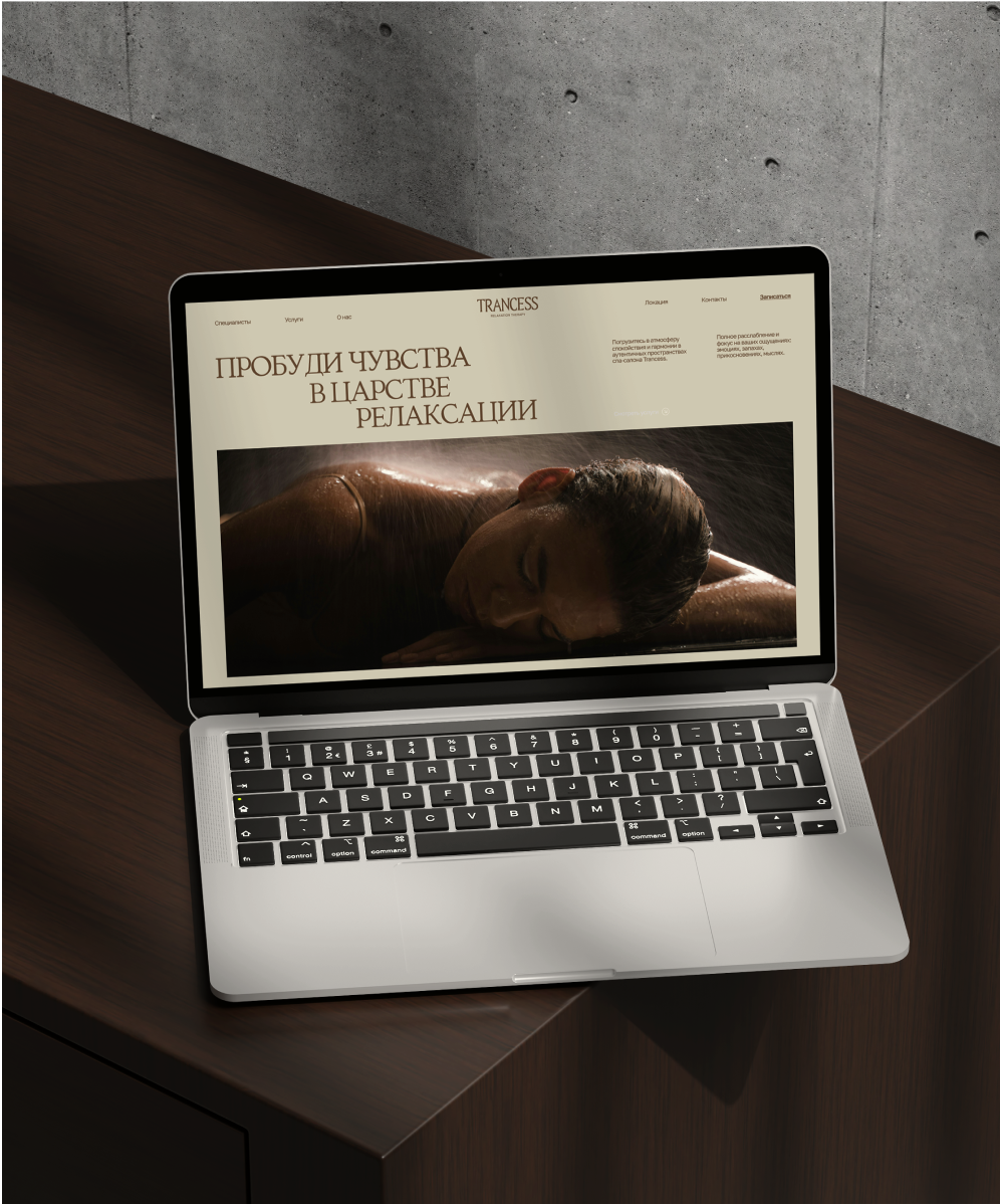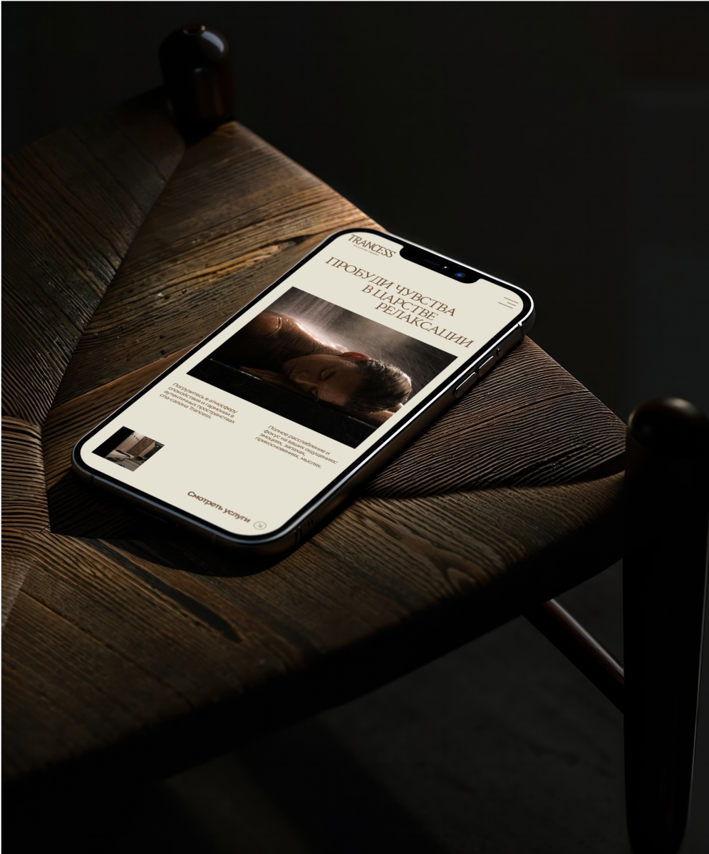 Для “Trancess” была разработана целостная визуальная идентичность, включающая уникальный логотип, фирменный стиль, цветовую палитру, типографику и макеты для различных носителей и сайта. Логотип состоит из тщательно продуманной шрифтовой части, созданной с нуля для максимальной гармонии с концепцией бренда, и дескриптора, который усиливает ассоциативную связь с идеей спа.