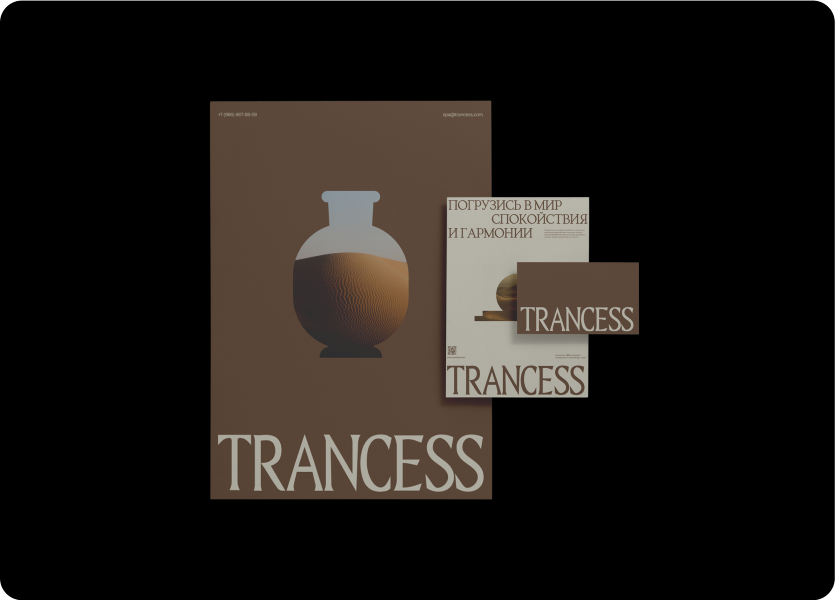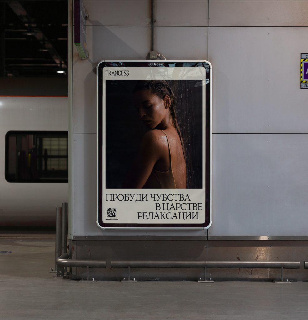 Фирменный стиль для проекта “Trancess” — это уникальное воплощение атмосферы спа-салона мидл+ сегмента, где ключевым элементом является полное погружение в мир расслабления и восстановления. Пространства салона созданы для того, чтобы каждый посетитель мог сосредоточиться на своих ощущениях — будь то эмоции, ароматы, прикосновения или внутренние размышления.